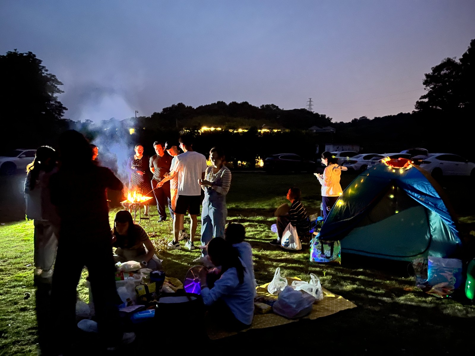 稍事休息后,青年教师们搭帐篷、架设篝火,生火,分工明确,配合默契,忙得不亦乐乎。夜幕降临,篝火点燃,在食物烘烤的温暖烟火气里,同事们围坐在炭火旁分享着自己工作、生活中有趣的故事,其乐融融,将徒步的疲惫抛在脑后……